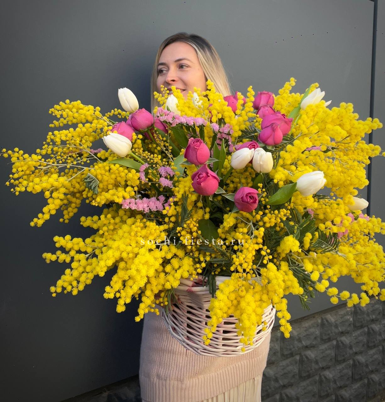 Солнечная мимоза встречается с тюльпанами и пионовидными розами Мисти Бабблс. Весенняя палитра собрана в корзине, где каждый цветок занимает свое место в общем ритме.