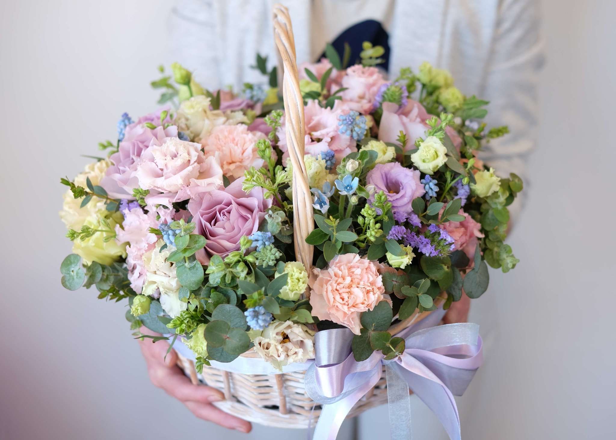 Масштабная корзина объединяет лилии, гортензии, антиринум, розы и эустому в единую объёмную композицию. Высота и насыщенность каждого слоя создают впечатление цветочного изобилия.