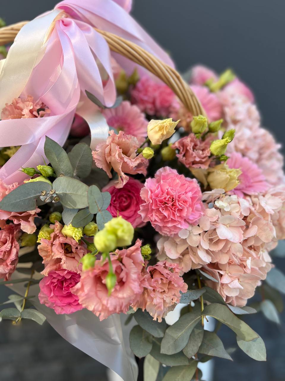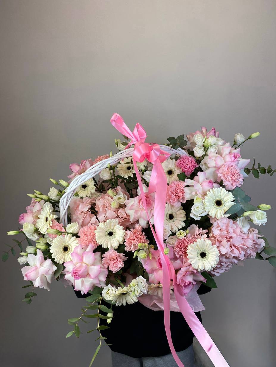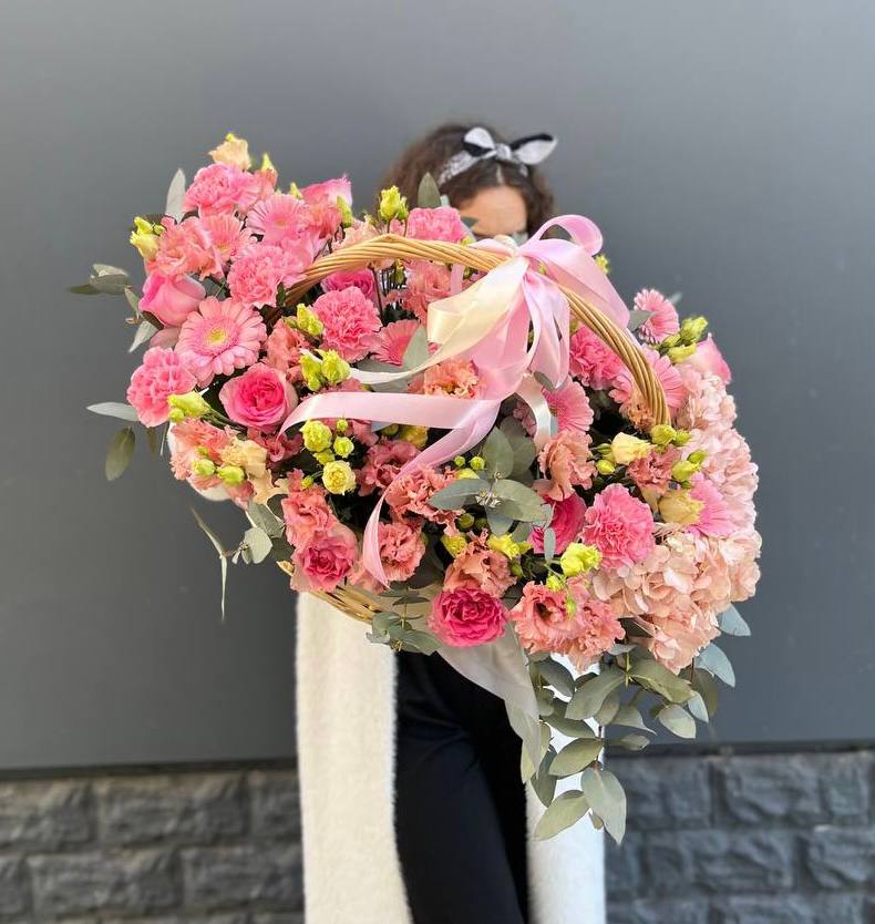 Гортензия и эустома задают объём, а яркие герберы расставляют цветовые акценты по всей композиции. Диантус и хайди добавляют воздушности, эвкалипт завершает силуэт мягкими линиями. Корзина держит форму и создаёт устойчивую основу для пышной композиции.