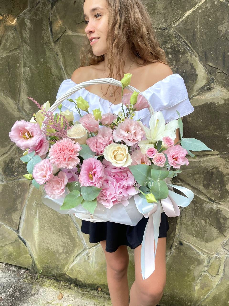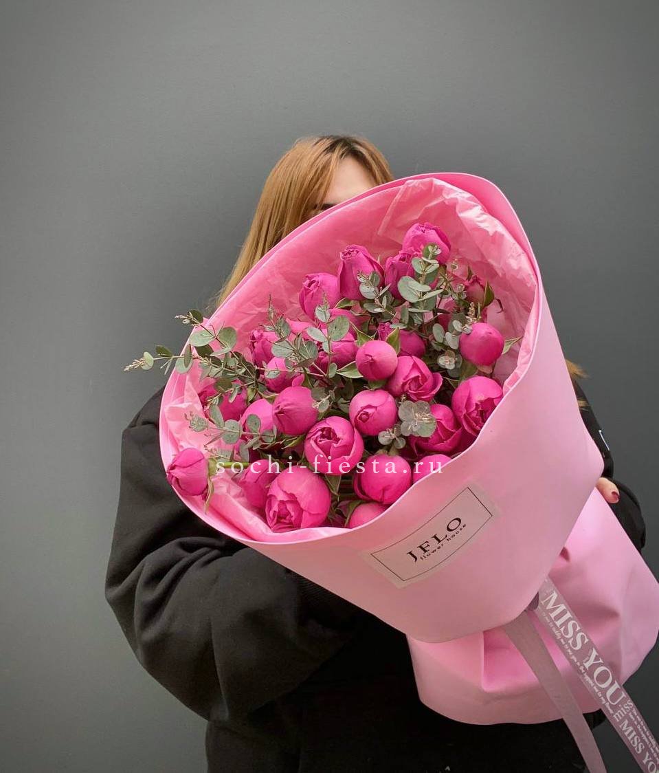 Сорок одна пионовидная роза в светлой корзине выстраивает объёмную композицию с мягкими переливами лилового и розового. Эвкалипт обрамляет густую россыпь бутонов.