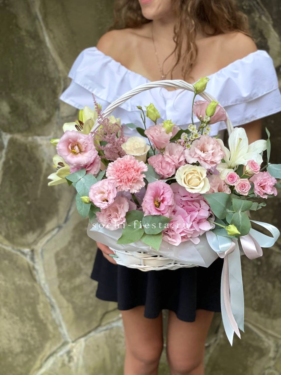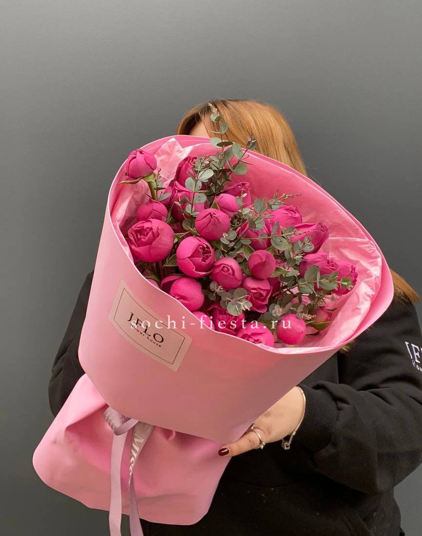 41 пионовидная кустовая роза Misty Bubbles, эвкалипт, светлая корзина.