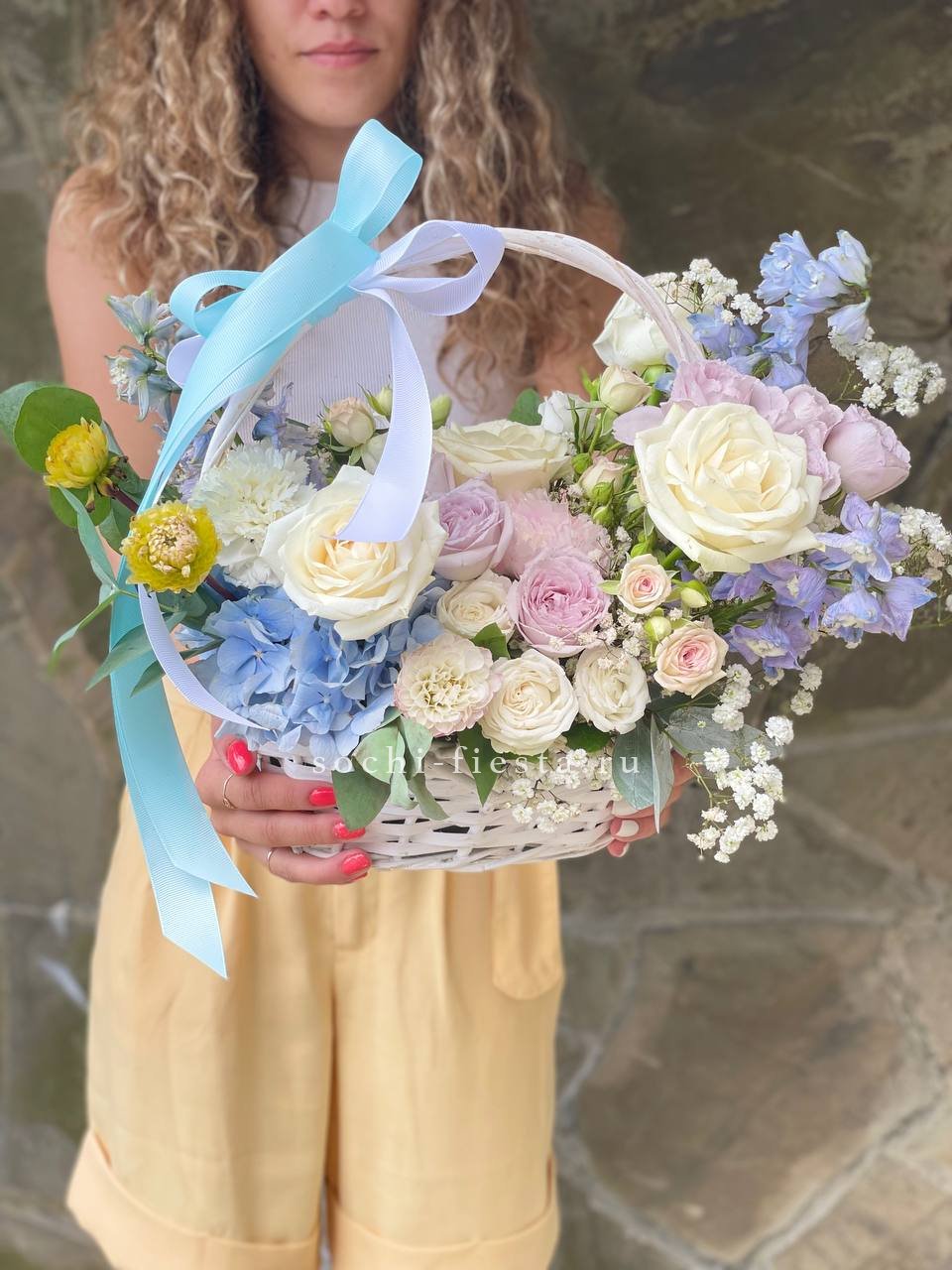 диантус, роза кустовая, гипсофила, гортензия, дельфиниум/львиный зев/маттиола (замена вне сезона), белая роза, георгины или аналог, эвкалипт, оазис, корзина D 25, двойной бант Состав композиции может быть незначительно изменен флористом в процессе изготовления с соблюдением стилистики, фактуры и цветовой гаммы оригинала.
