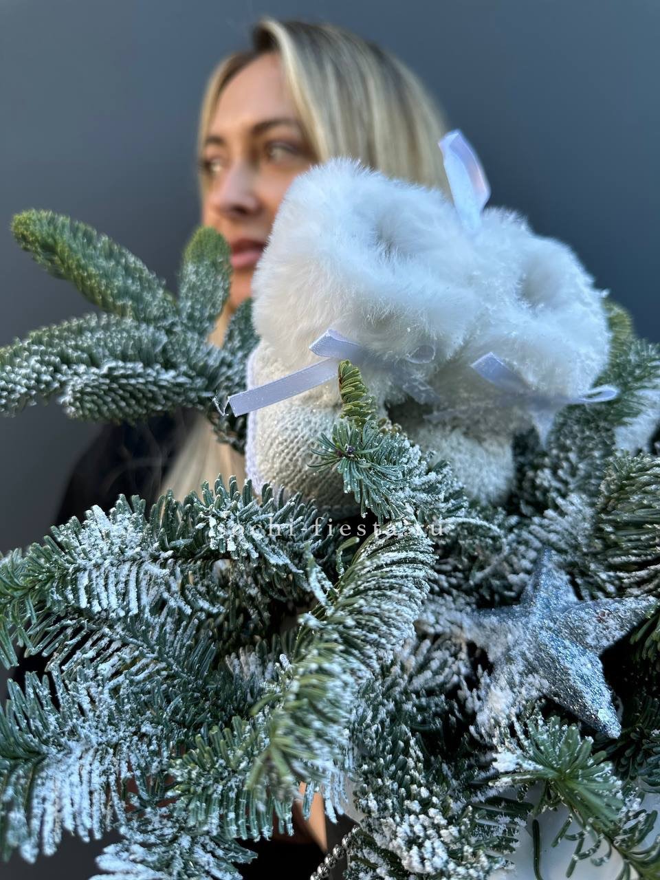 Белоснежные сапожки и хвоя нобилиса собраны в компактную праздничную форму. Матовые шары добавляют объём и завершают зимнюю картину без лишних деталей.