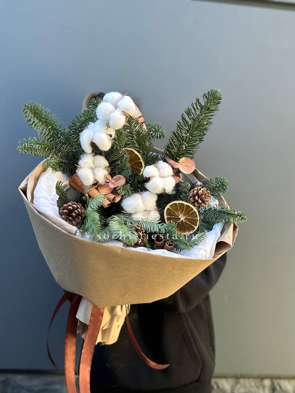 Веточки датского нобилиса образуют пышную основу, где каждый элемент находит своё место. Сушёные апельсины и палочки корицы добавляют тёплые оттенки, хлопок создаёт мягкие акценты, а шишки завершают композицию природными формами.