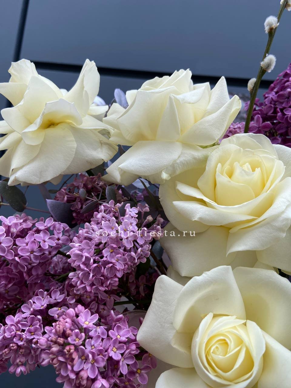 Белые розы и герберы собраны в круглую форму вместе с пушистыми веточками вербы и душистой сиренью. Композиция в коробке держит объём и выглядит цельно. Весенний букет для светлых дней и семейных встреч.