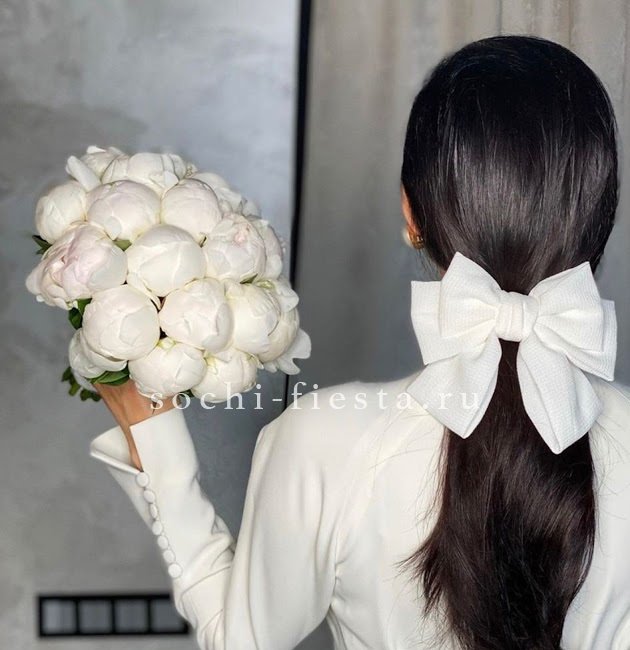 Двадцать один белоснежный пион собран в пышную шарообразную композицию которая заполняет пространство волнами многослойных лепестков. Минималистичное решение для свадебного дня.