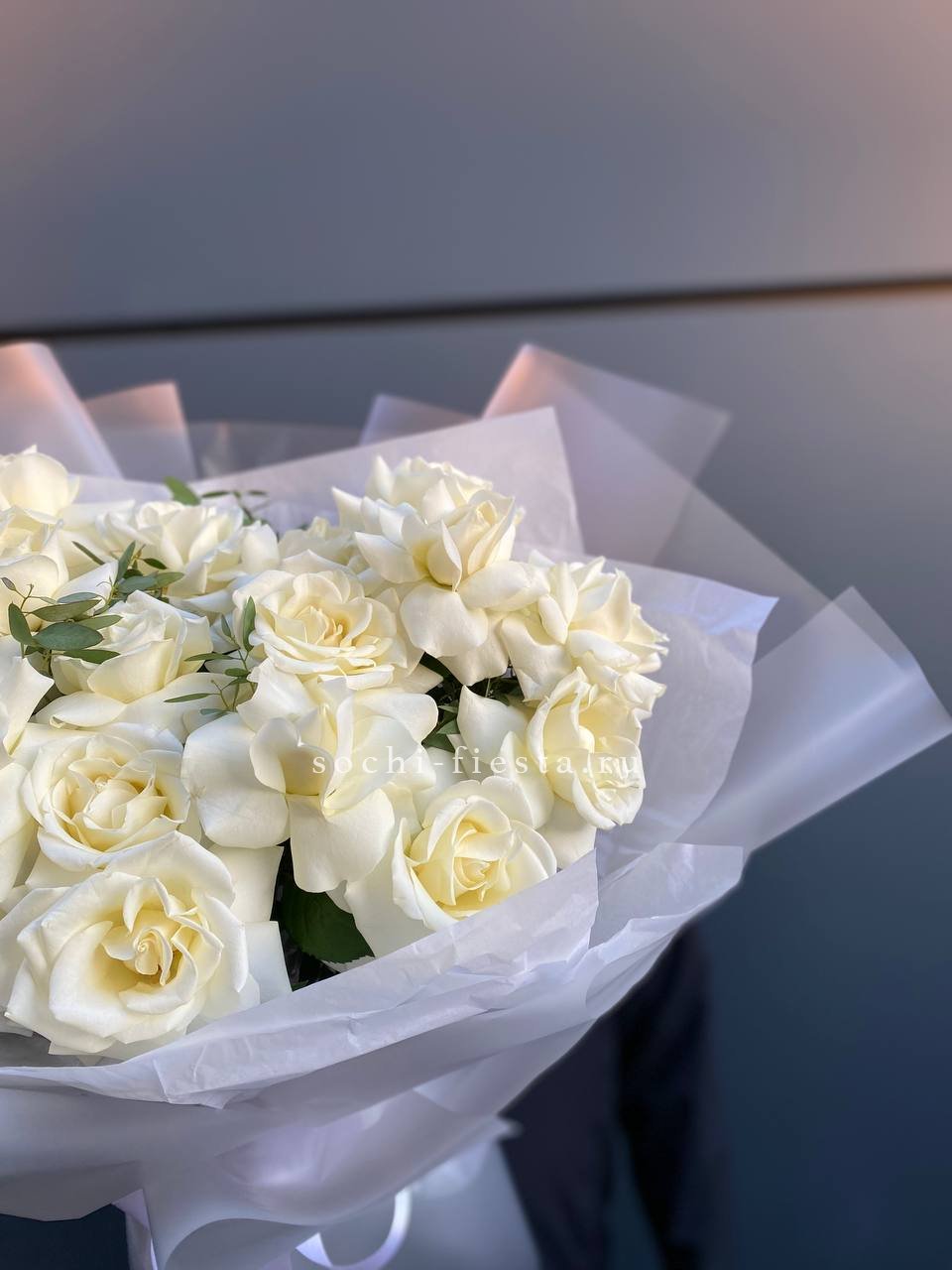 французские розы - 21 шт., эвкалипт - 2шт., лента, авторская упаковка.