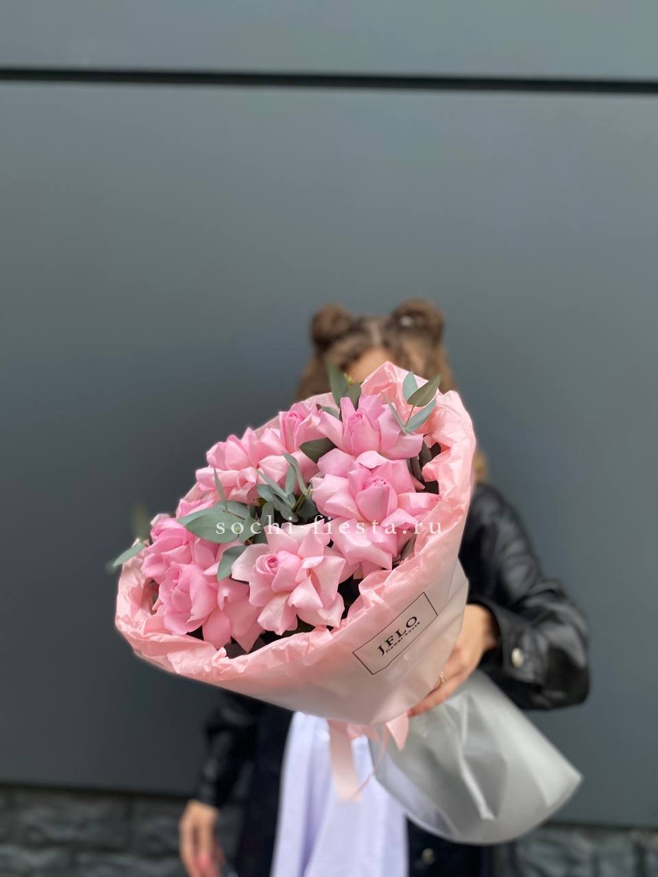 Семь вывернутых роз образуют компактную группу с чистым силуэтом. Ветки эвкалипта задают вертикальный ритм и добавляют воздуха между бутонами. Букет держит форму и выглядит собранно.