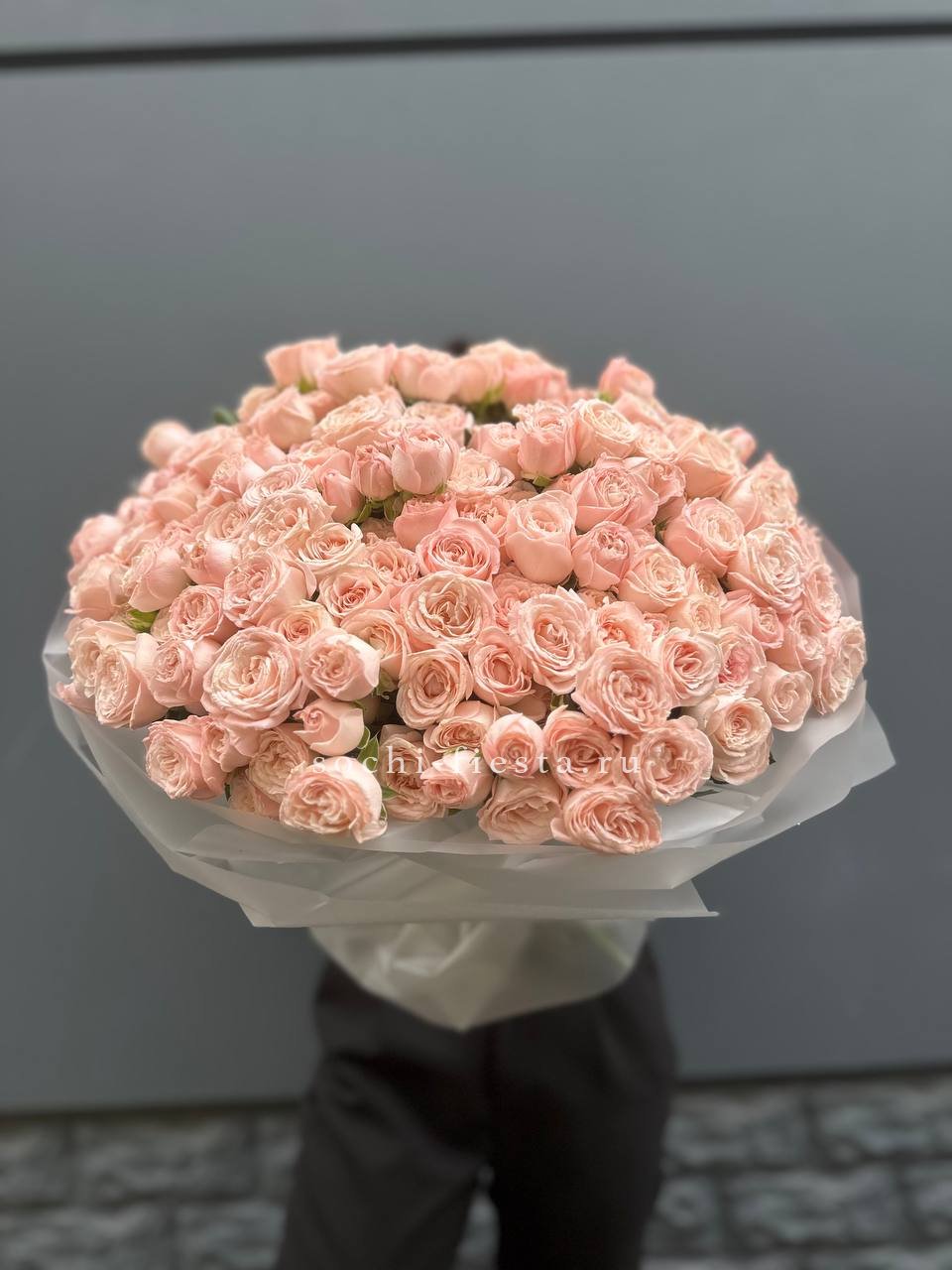 Пятьдесят один бутон сорта Бомбастик с густомахровыми лепестками кремового оттенка. Плотная сборка создает впечатляющий объем и заполняет пространство. Монобукет для тех моментов, когда важен масштаб.