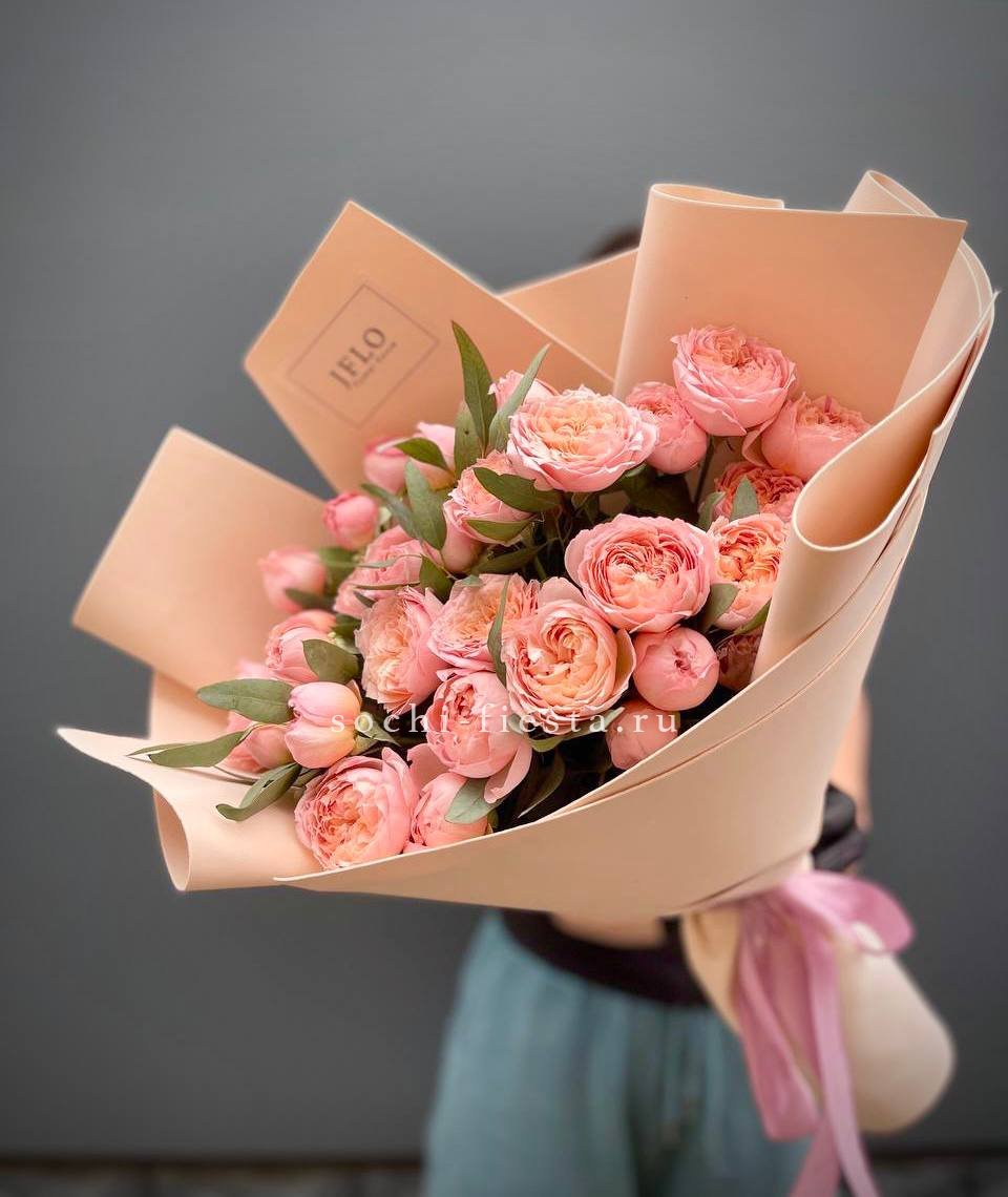 яркий букет из 9 пионовидных кустовых роз с эвкалиптом.