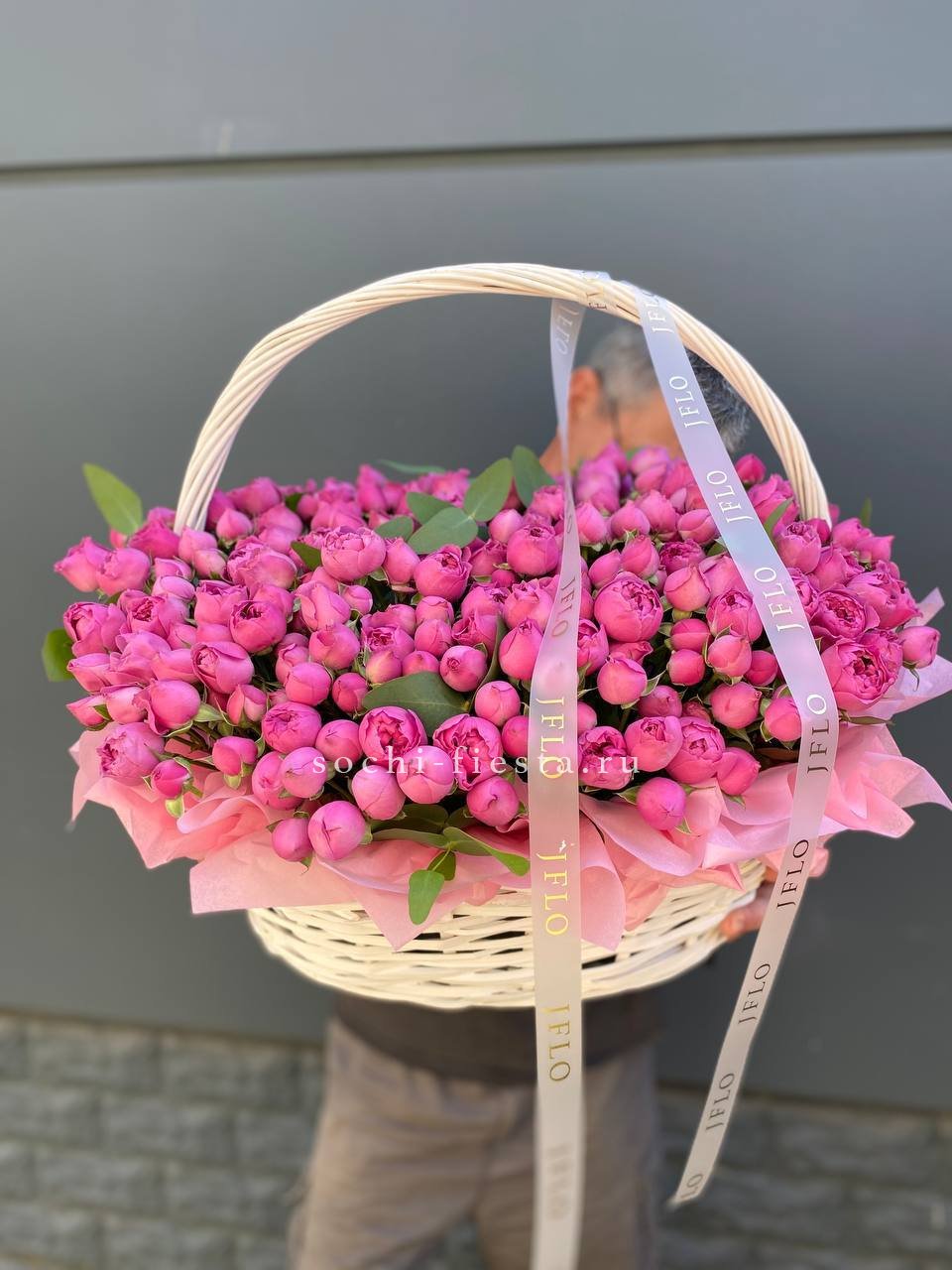 Сто одна роза сорта Мисти Баблс собрана в плетёную корзину светлого оттенка. Плотное заполнение создаёт цветочное облако с мягкими переливами лавандовых и кремовых тонов. Композиция занимает пространство и притягивает внимание.