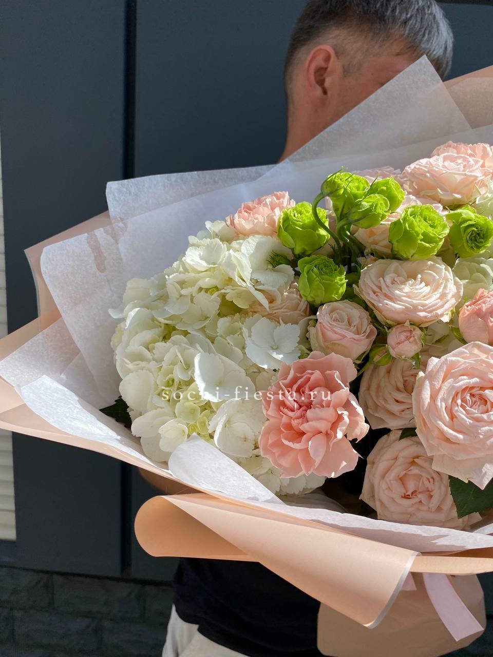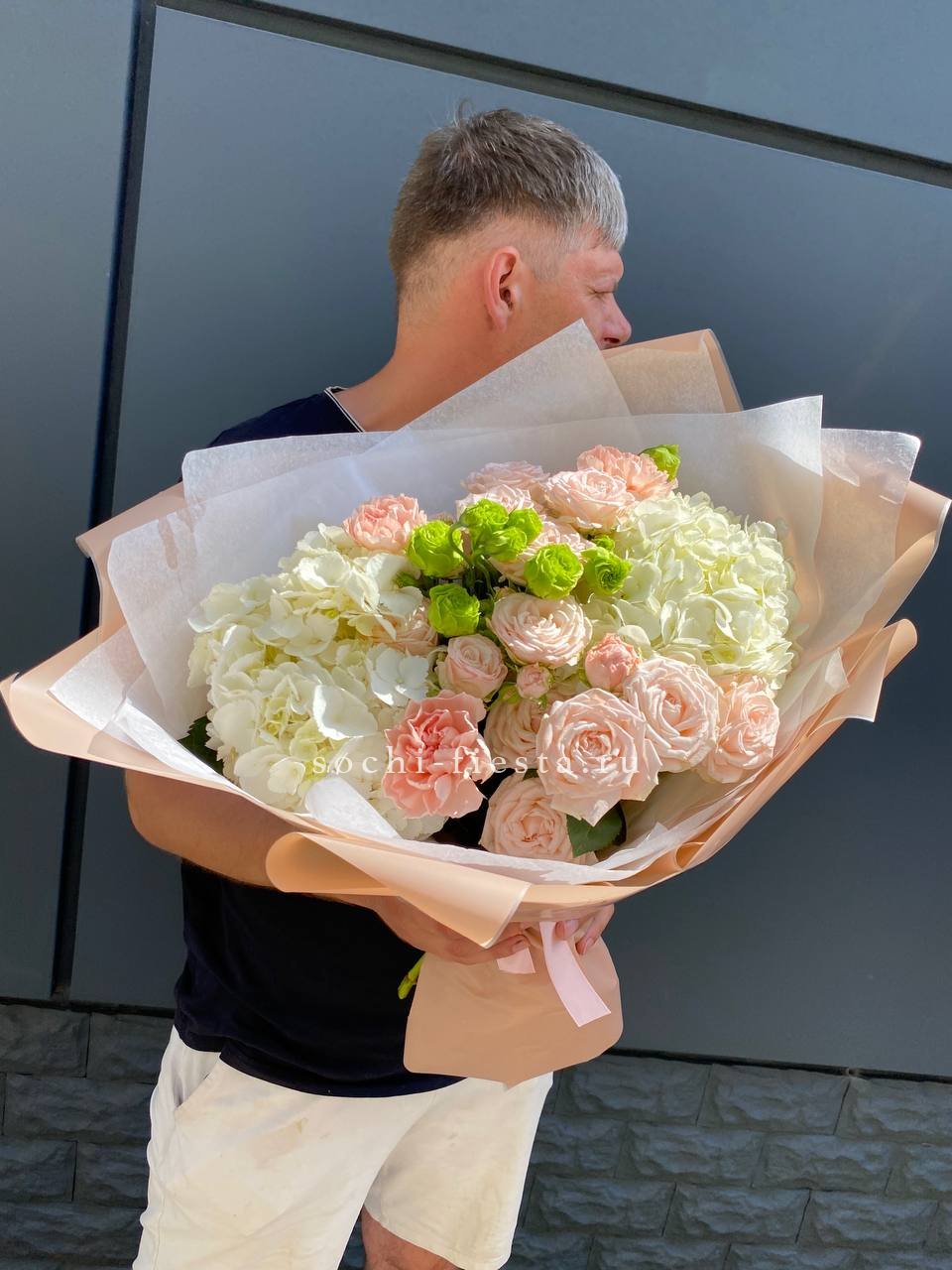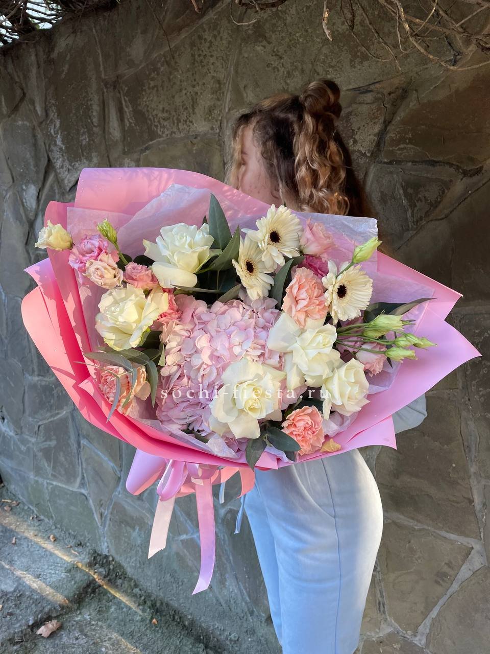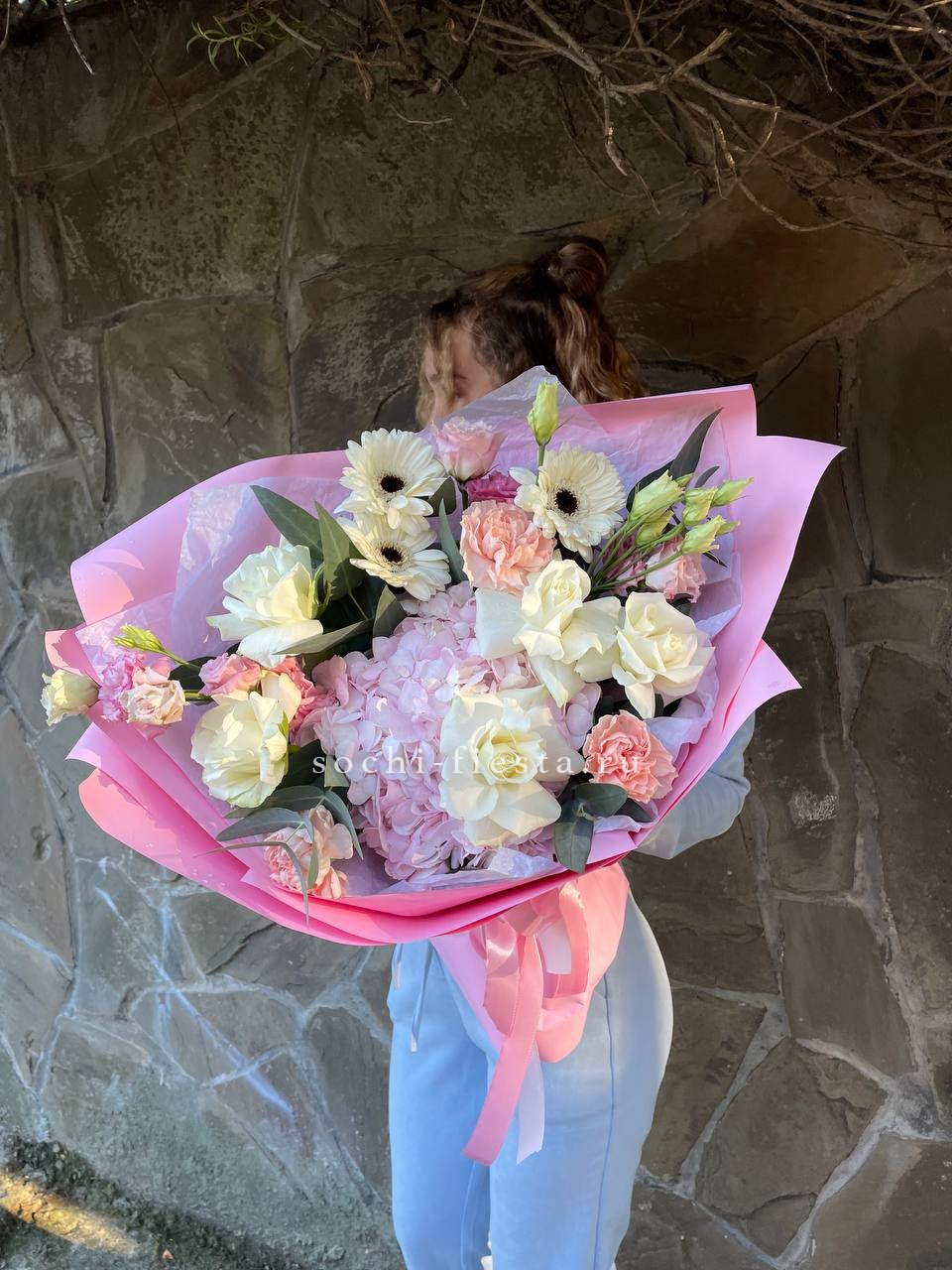 гортензия, эустома, кустовая роза, диантус, лента, упаковка Состав букета в несозон может нести незначительные изменения.