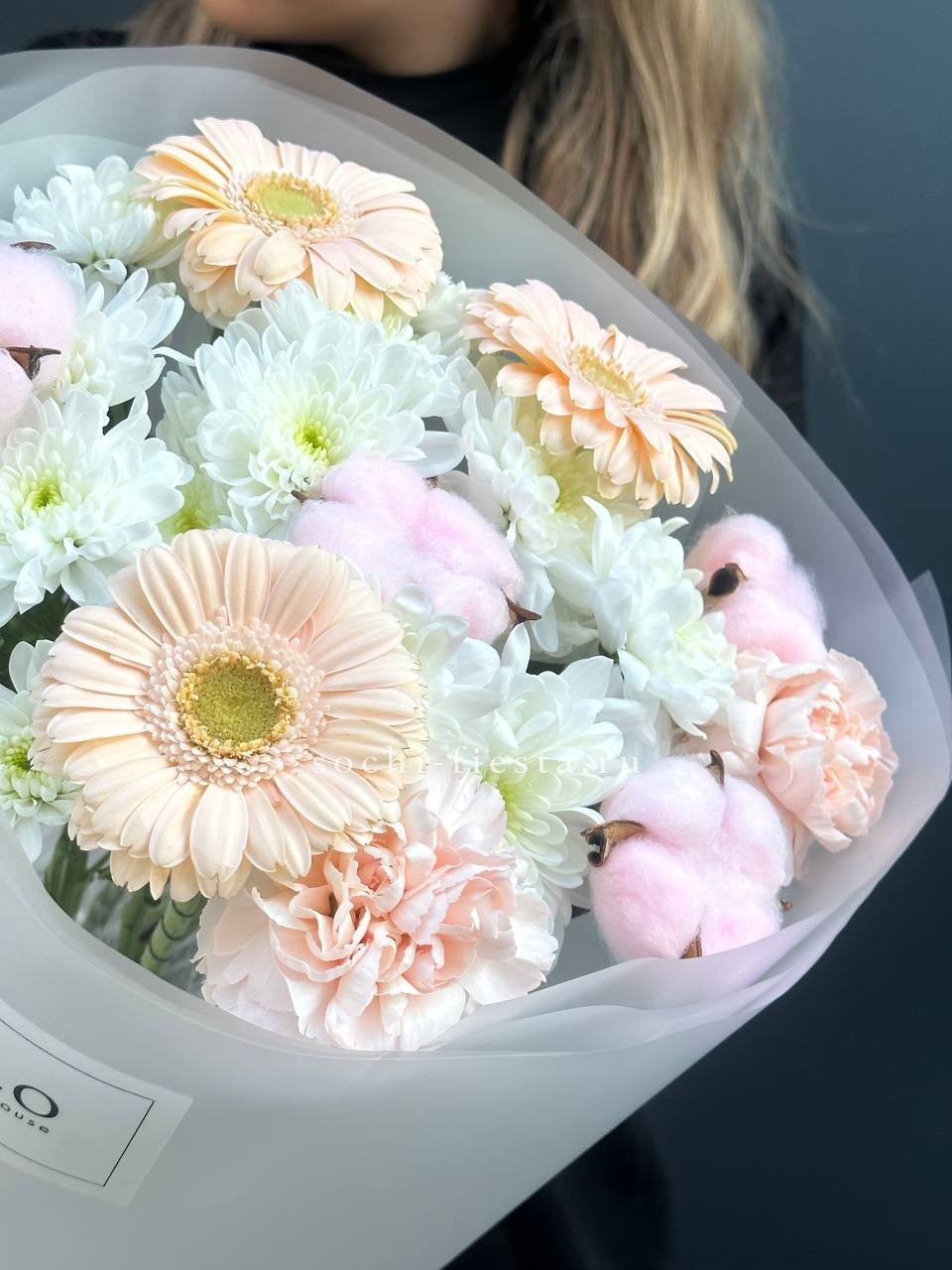 Пастельная гамма с переходами от белого к сливочному создаёт почти акварельный эффект. Гортензия и эустома образуют воздушную текстуру, а кустовая роза добавляет графичности. Букет напоминает летнее утро в саду.