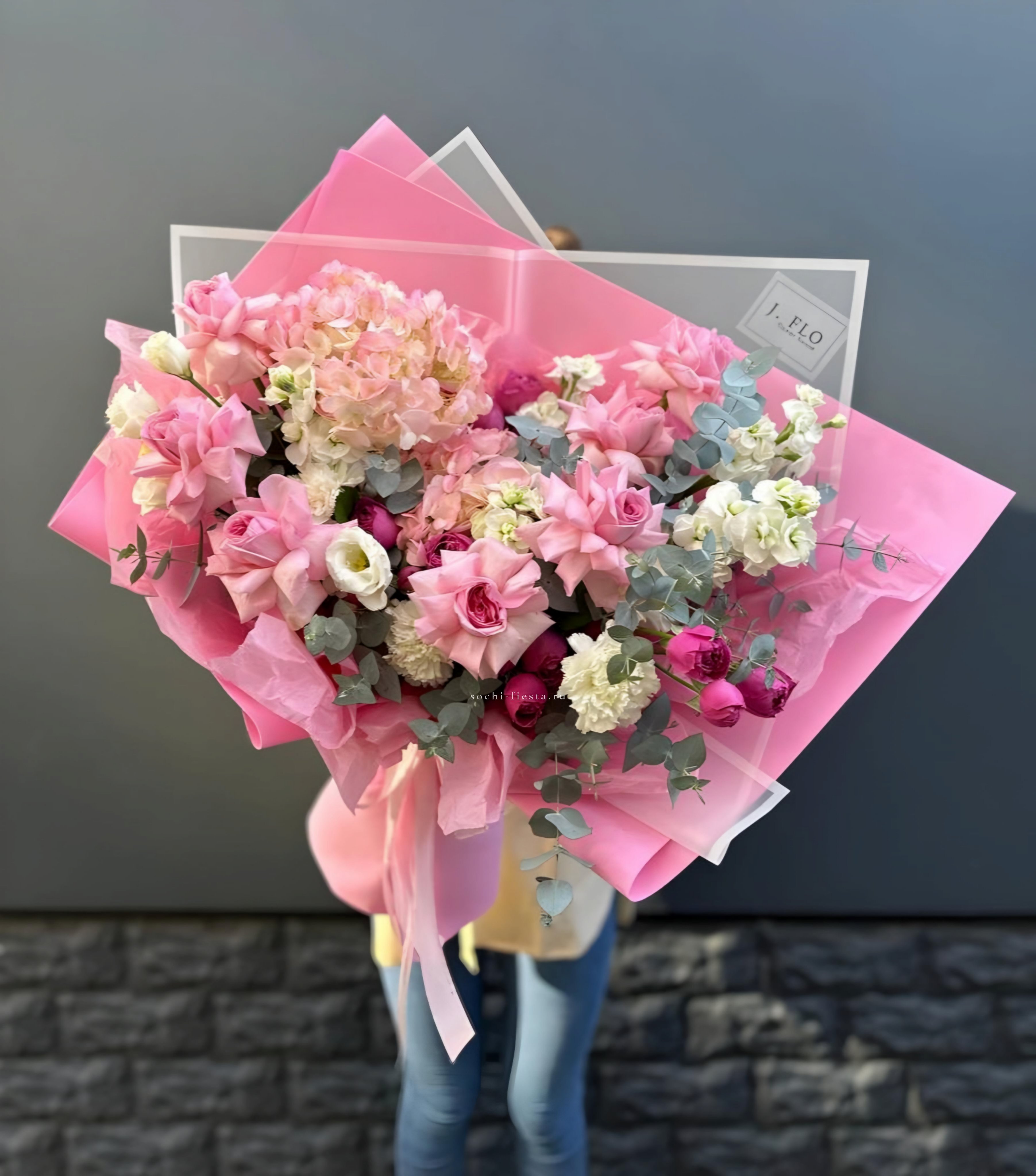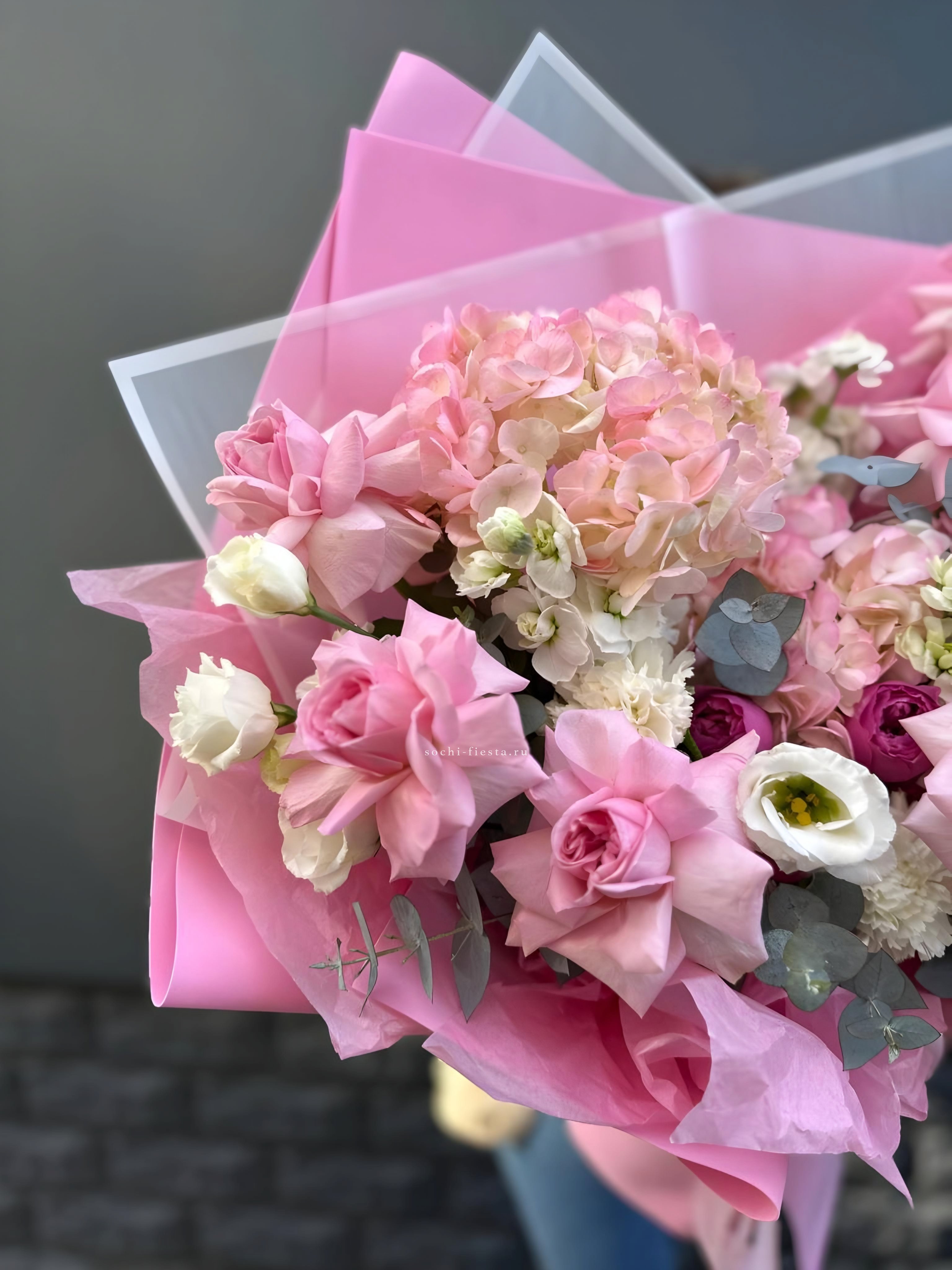 гортензия, розовые розы, диантусы, эустома, маттиолы, эвкалипт лента и дизайнерская пленка.