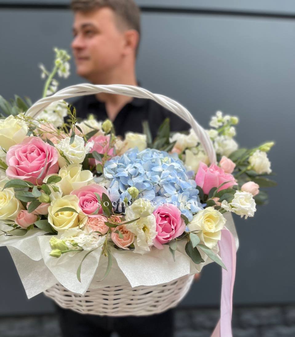 Пышная шапка гортензии переходит в розовые розы и маттиолы, создавая многослойную структуру. Эвкалипт обрамляет композицию, добавляя графичности и свежести.