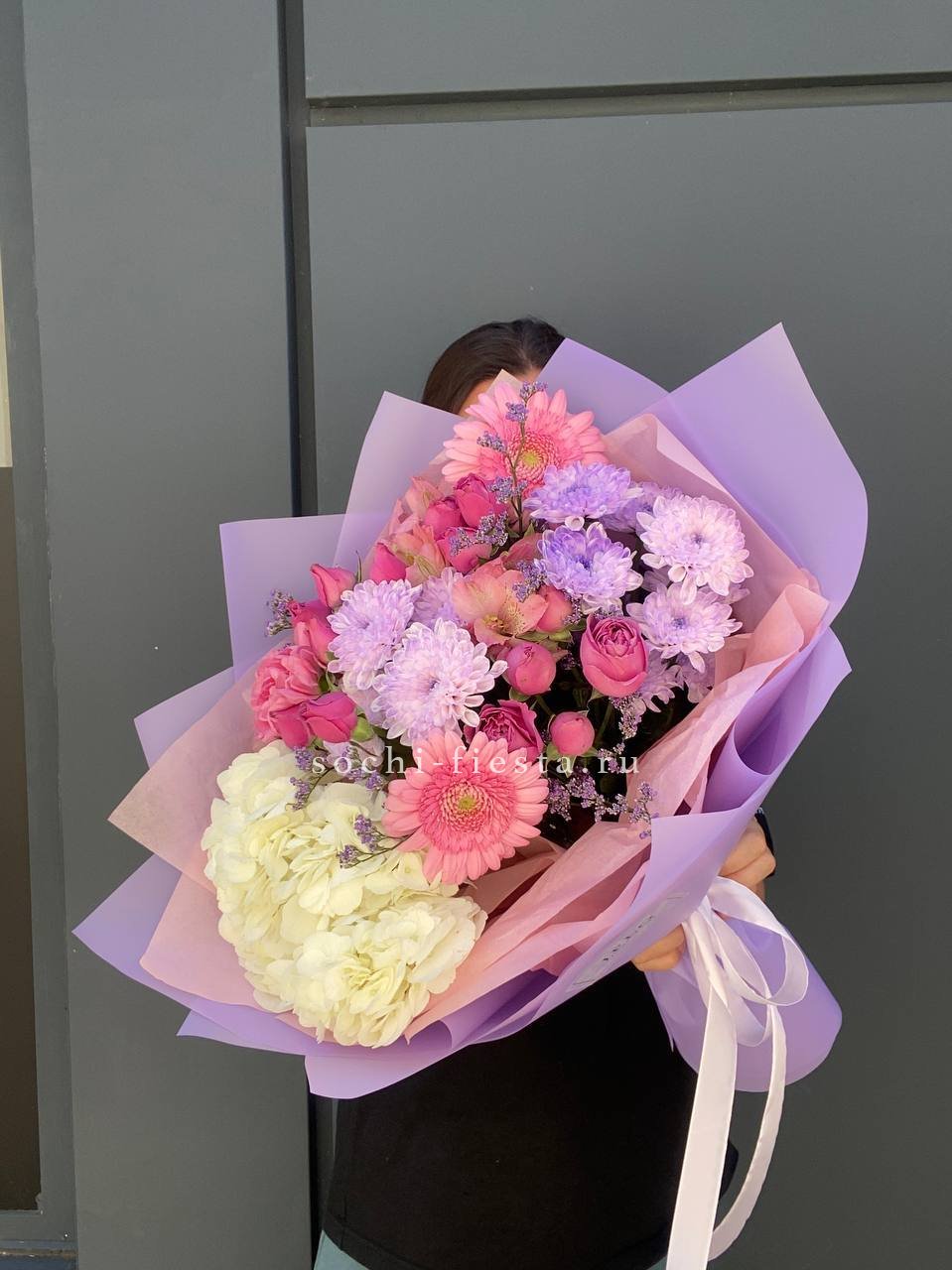 гортензия, кустовые хризантемы, кустовые розы мисти бабблс, герберы, диантусы и лимониум, оформление.