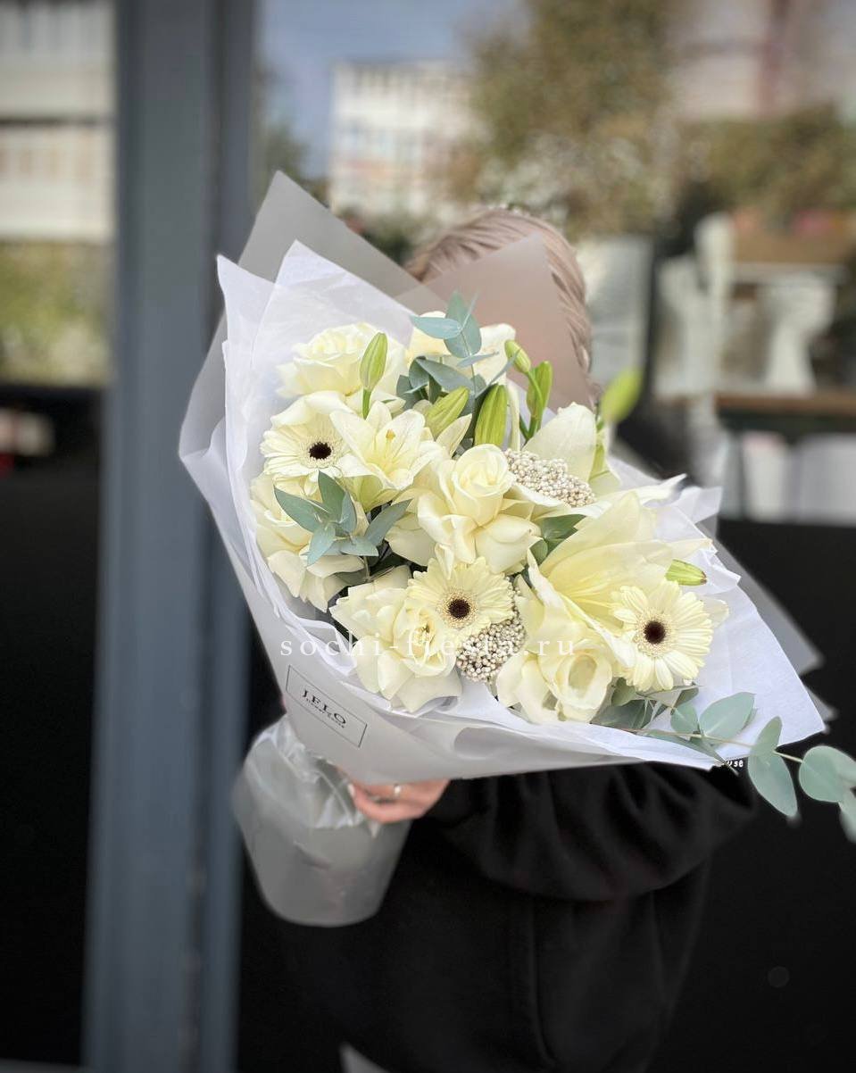 гербера, роза, лилия, озатамус, эвкалипт, упаковка.