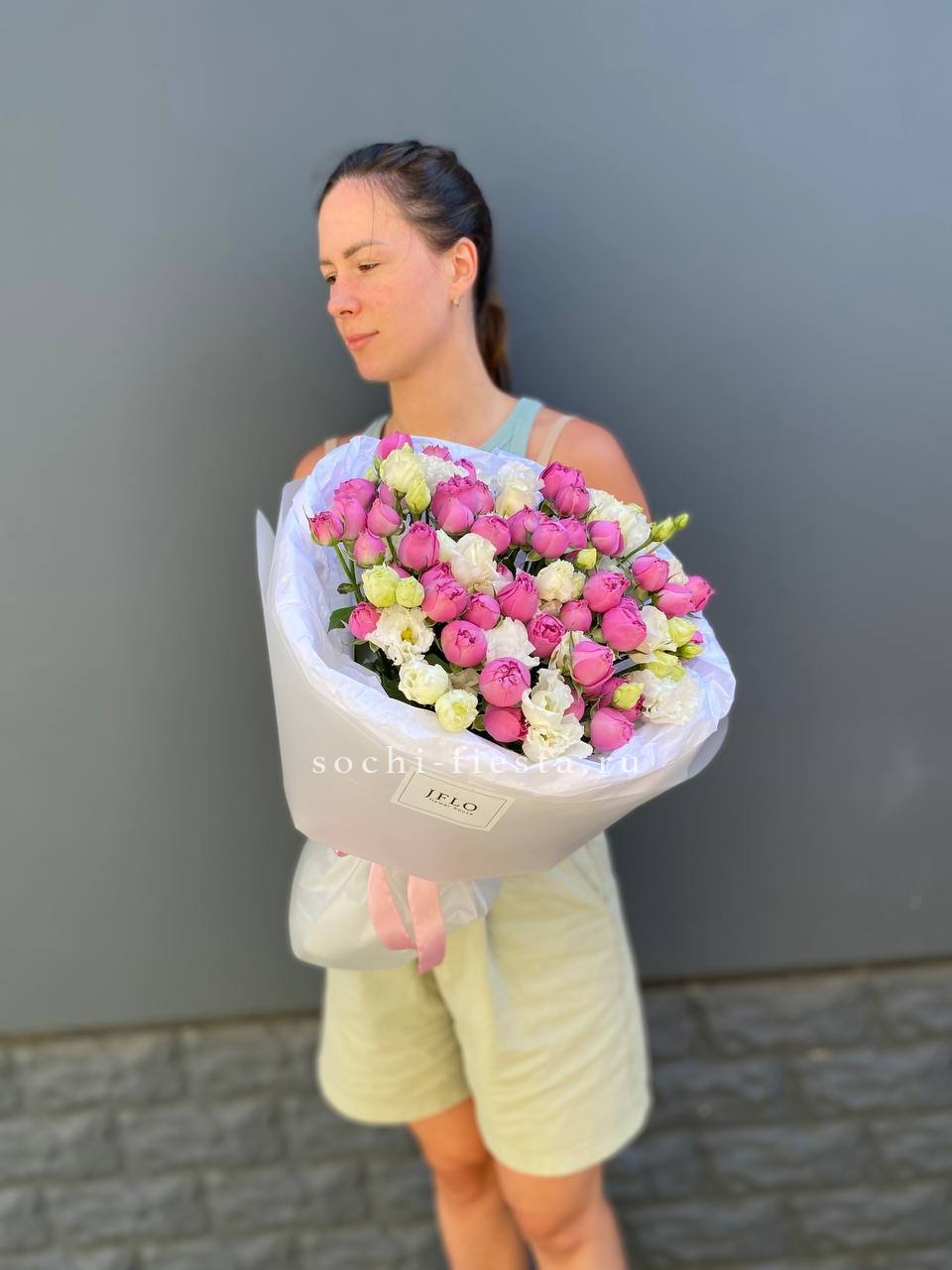 Кустовые розы и эустомы собраны в компактную форму с мягкими линиями. Сочетание нескольких оттенков создаёт живописный эффект без лишней пышности.