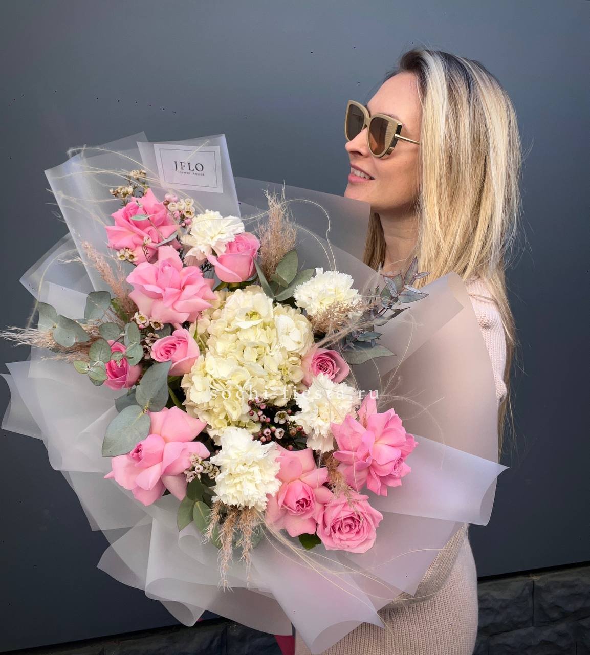 Гортензия задаёт пышную основу, а маттиола и лимониум наполняют букет текстурной глубиной. Французские розы и ковыль создают динамику, которая оживляет композицию и придаёт ей выразительность.