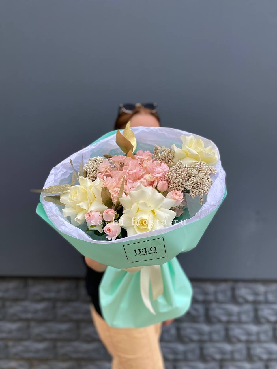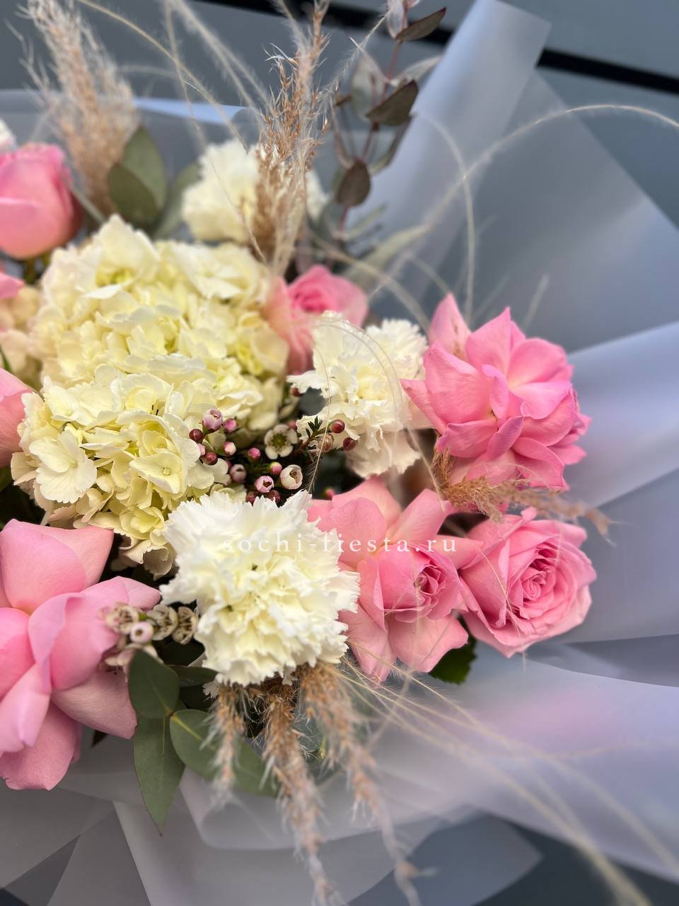 гортензия, французские розы, маттиола, лимониум, дианстусы, эвкалипт, ковыль и дизайнерская упаковка.