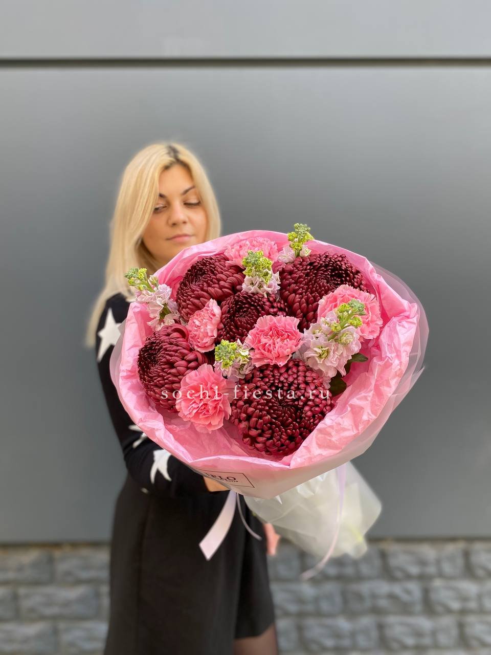 Воздушная композиция с пышными головками маттиолы и яркими диантусами создаёт лёгкое весеннее настроение. Каждый бутон раскрывается по-своему, добавляя объём и живую динамику всему букету.