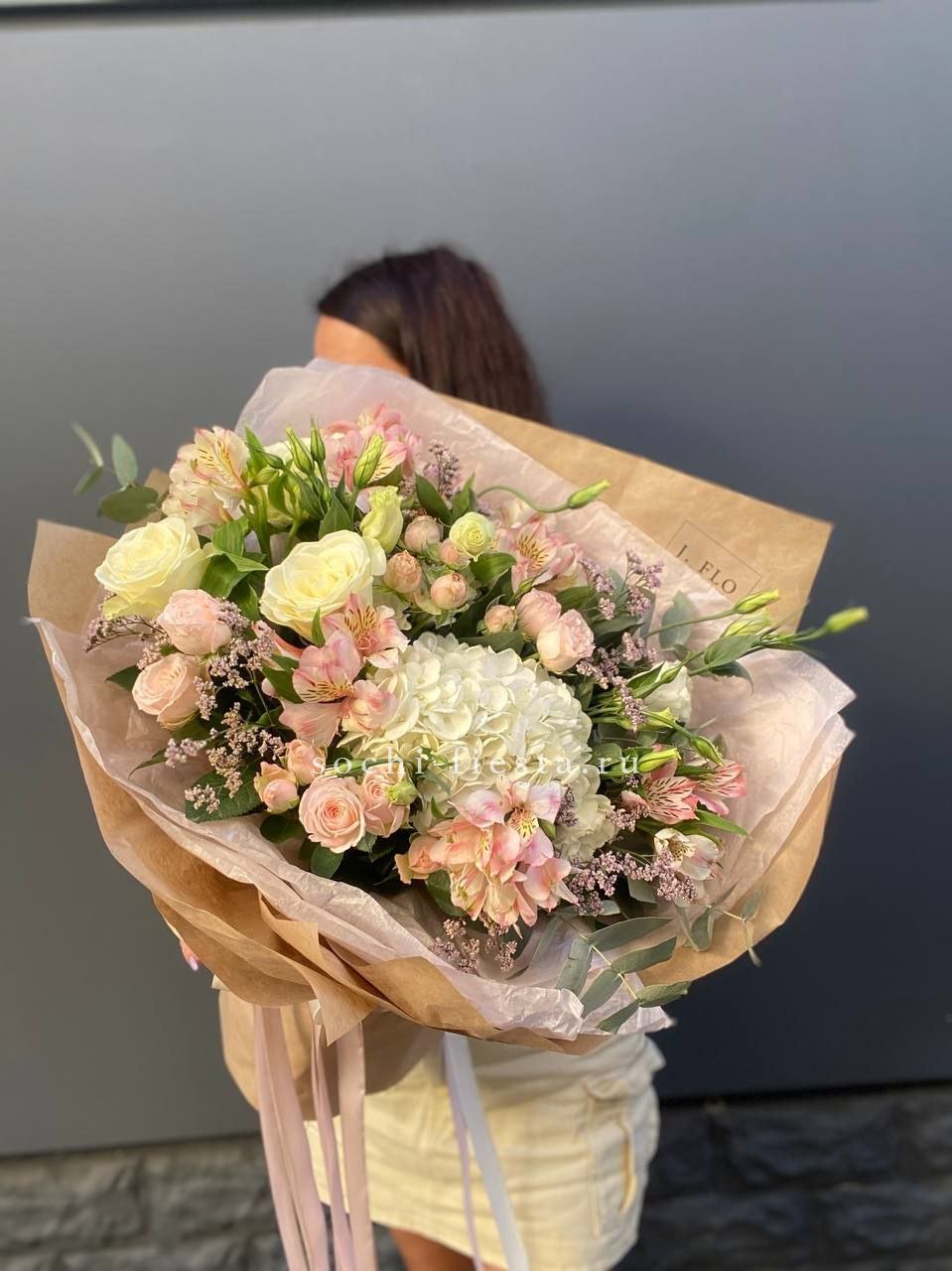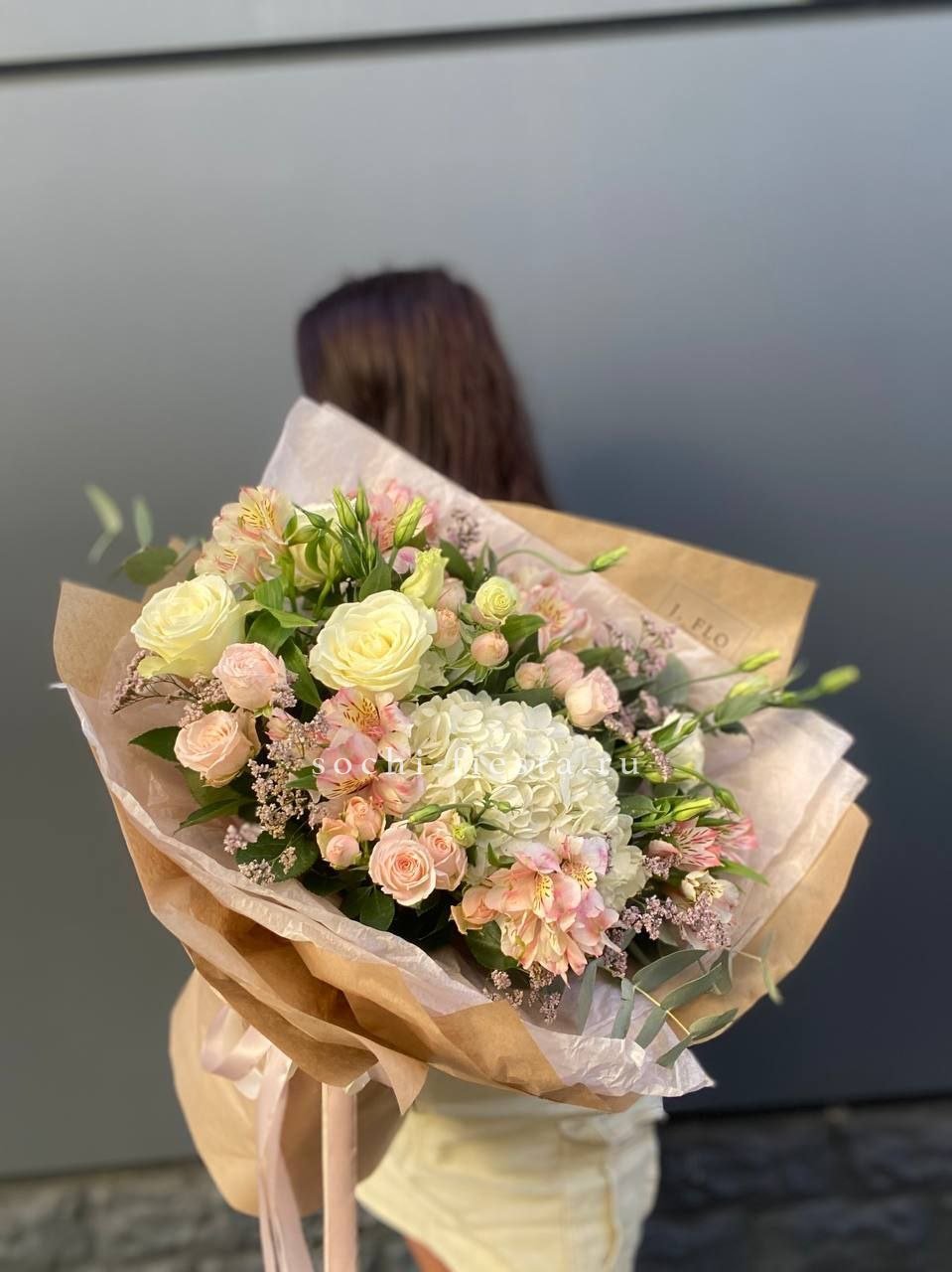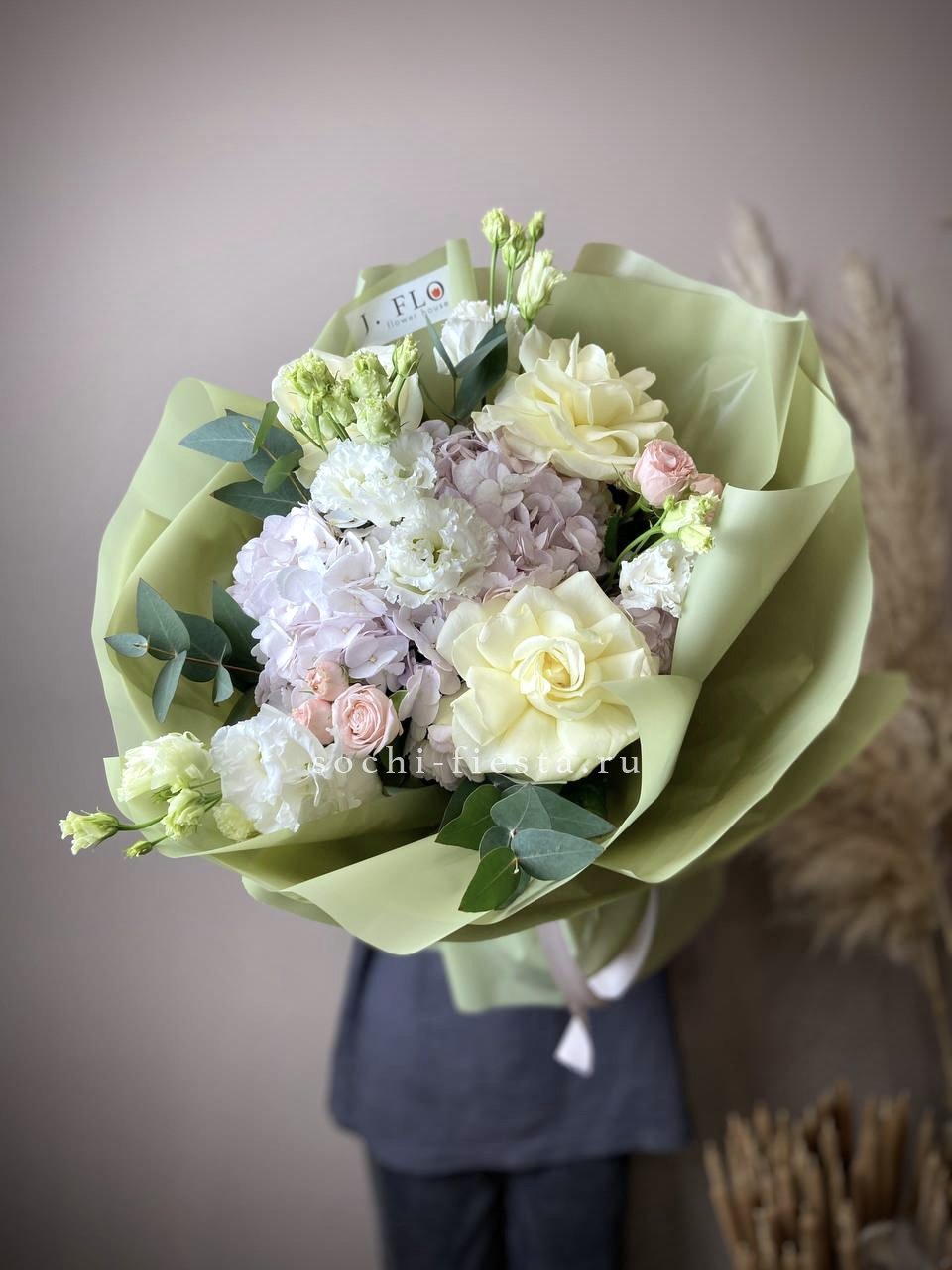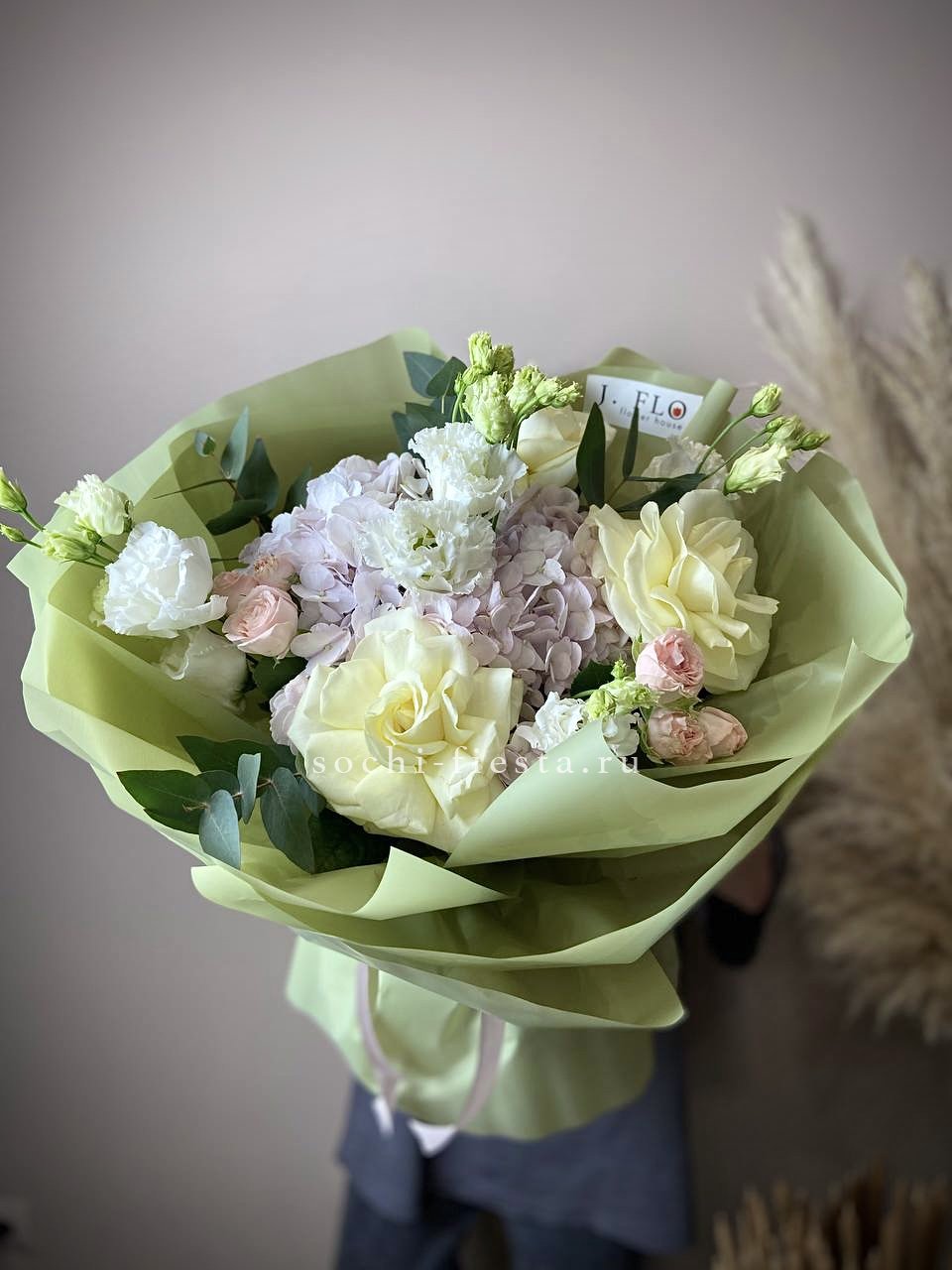 Масштабная композиция с пионами, эустомой и розами разворачивается во всей красе. Хризантемы и гортензия создают впечатляющее присутствие, которое преображает пространство вокруг.