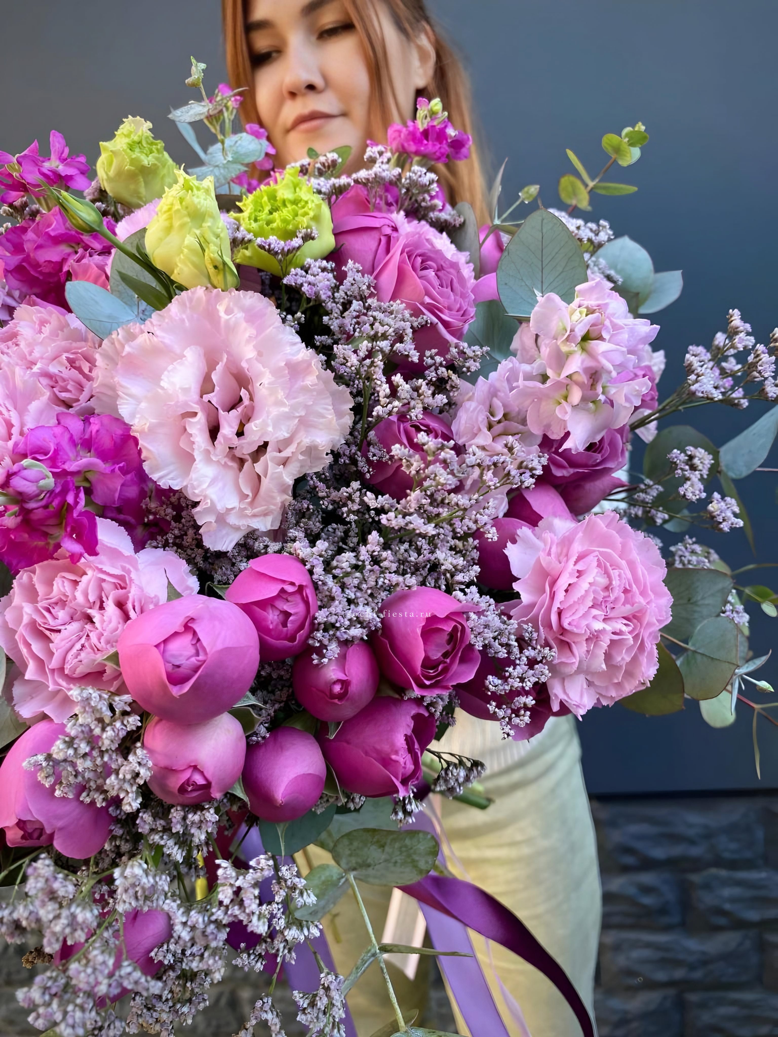 Маттиола и эустома создают воздушную текстуру, а пионовидные розы Мисти Баблс добавляют глубину каждому слою. Лимониум и эвкалипт заполняют пространство между бутонами, формируя сложный рисунок. Букет звучит современно и свободно.