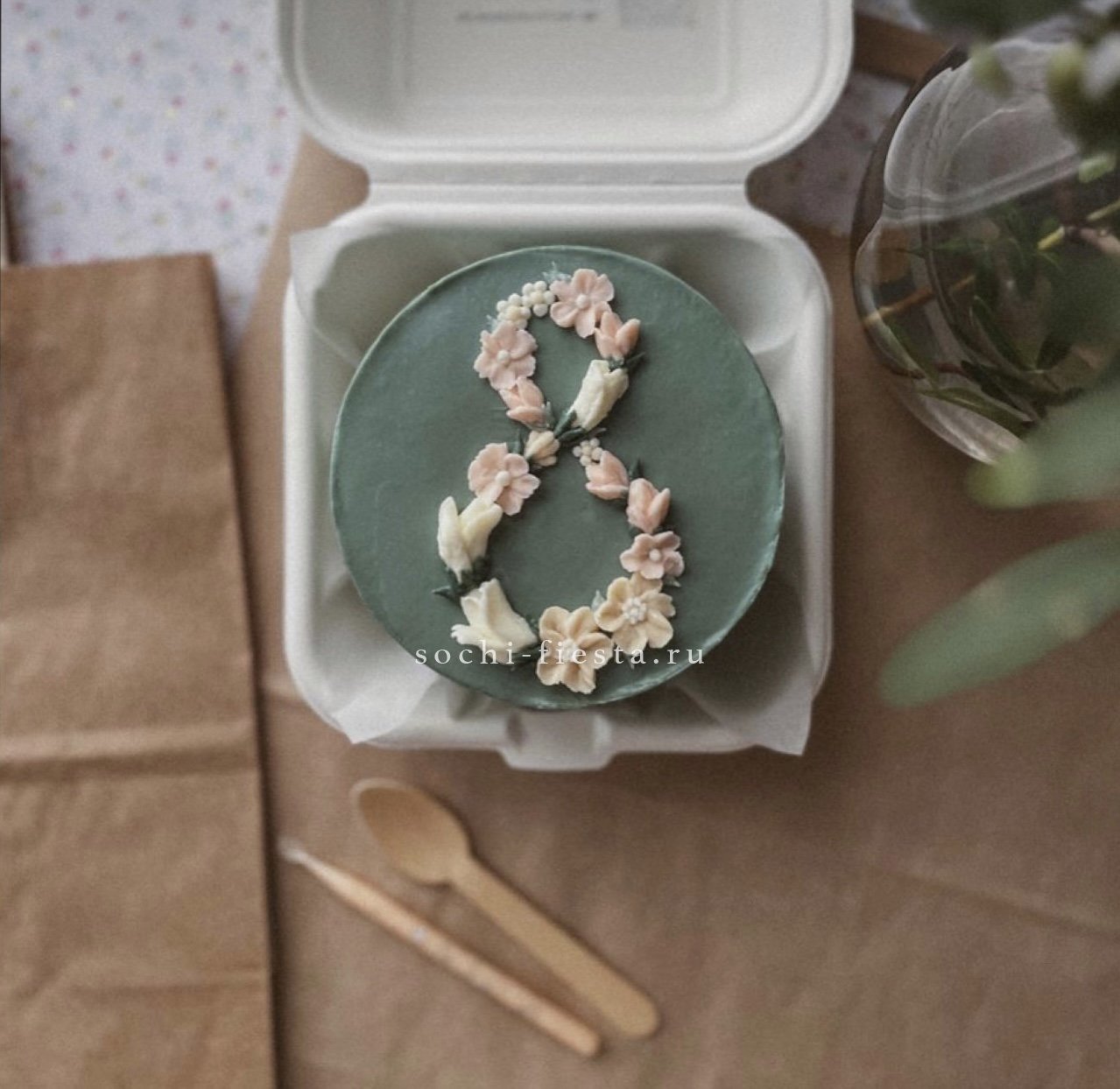 Весенний бенто-торт в бело-розовых тонах с акцентом на праздничную дату. Кремовая текстура создаёт лёгкий рельеф и цветочные мотивы. Два вкуса начинки на выбор.