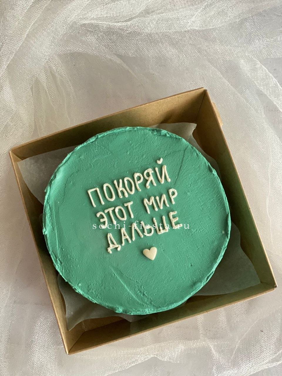 Дизайнерский бенто-торт с дерзкой надписью и минималистичным оформлением. Гладкая поверхность крема контрастирует с графичными элементами. Идея для тех, кто ценит юмор без границ.
